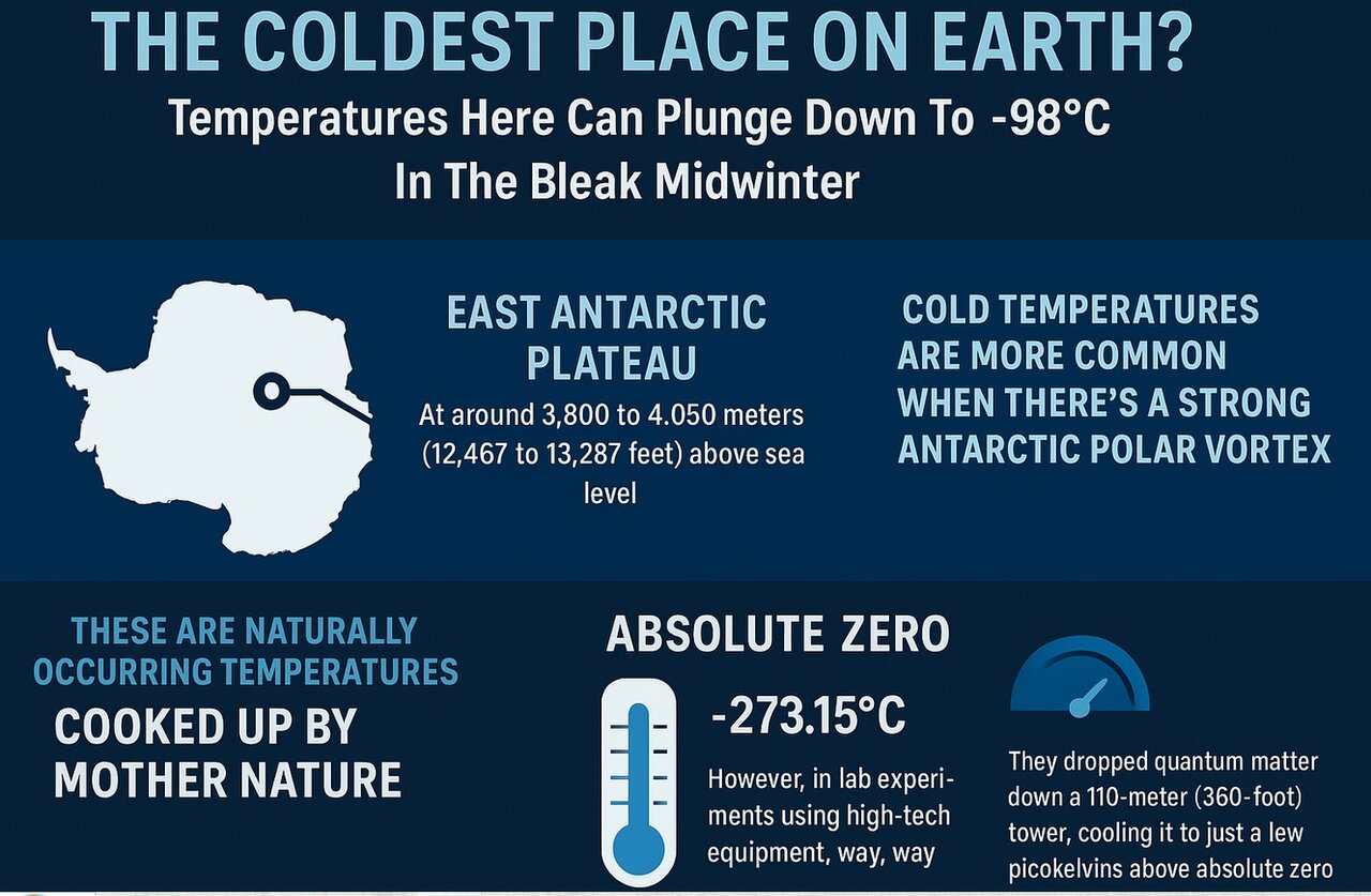 در روز ۲۳ ژوئن سال ۱۹۸۳ میلادی و در فصل تابستان، دمای هوا در ایستگاه وُستوک روسیه که یک بیابان متروک یخی است به حدود ۸۹.۲- درجهٔ سانتیگراد رسید که دمایی به مراتب پایینتر از میانگین همین منطقه بود؛ اما بعدها مشخص شد که در بخشهای دورافتادهٔ فلات شرق قطب جنوب، نقاطی حتی سردتر از این هم وجود دارد.