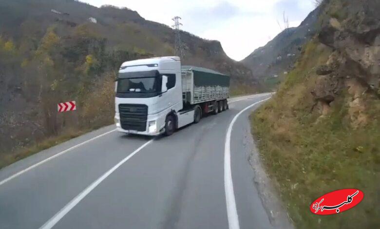 دوربین ثبت تخلفات رانندگی یک خودرو لحظاتی از رانندگی عجیب خودرو های سواری مقابل تریلی را ثبت کرده است./iha haber
