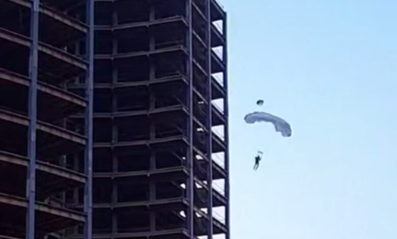 تصاویری از بیس جامپ خطرناک از ساختمان ۵۴ متری در فضای مجازی منتشر شده است. منبع: خبرفوری
