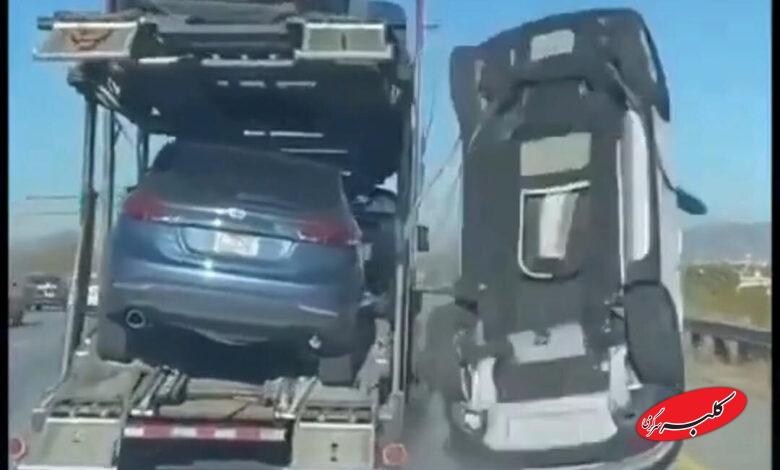 ببینید | سقوط خودروی از روی تریلی خودروبر در بزرگراه؛ ترافیک سنگین و اختلال گسترده در تردد