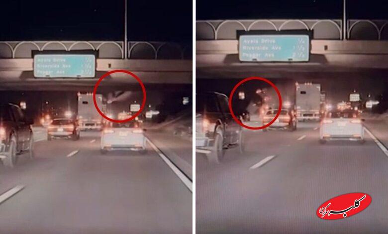 دوربین داشبورد یک خودرو، لحظهای وحشتناک را ثبت کرد که طی آن یک وانت در سنبرناردینو از روی یک روگذر به پایین سقوط کرد و به جاده زیرین برخورد؛ حادثهای که تصاویر آن بازتاب گستردهای داشته است./abc news