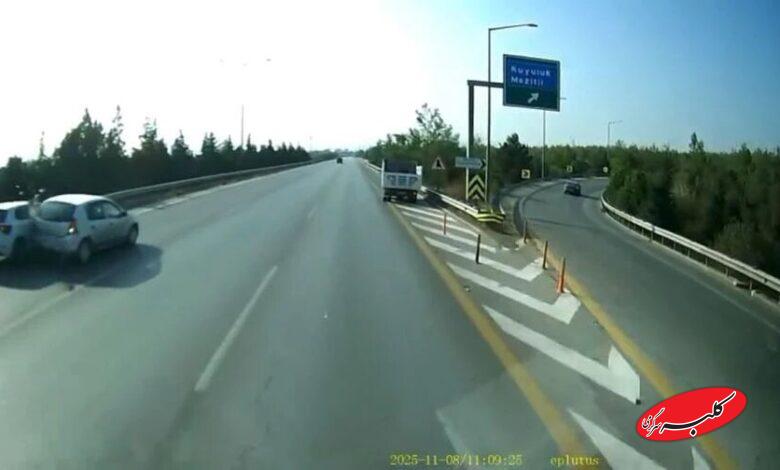 خودرو در حال حرکت پس از برخورد با خودروی دیگری که در لاین چپ بزرگراه ایستاده بود، به موانع برخورد کرد. در این حادثه کسی زخمی نشد و لحظات توسط دوربین خودروی دیگری ضبط شد./iha haber