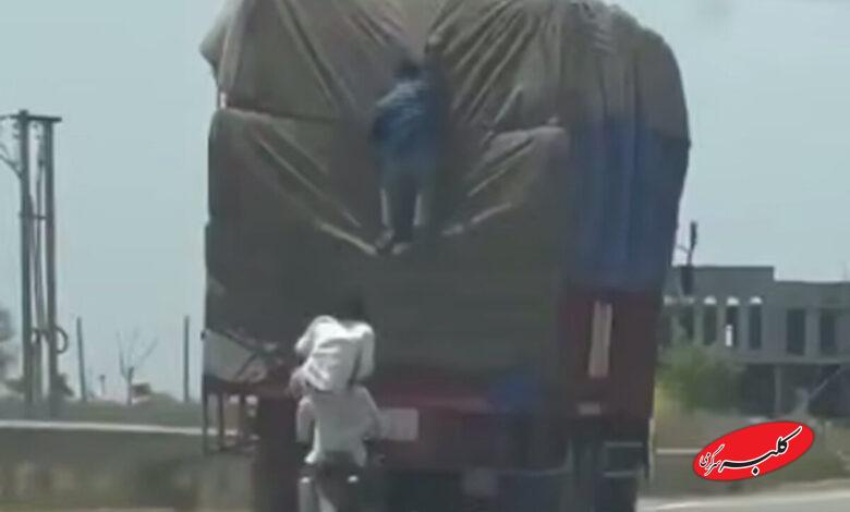 ببینید | ویدئویی از سرقت عجیب از یک کامیون در حال حرکت!