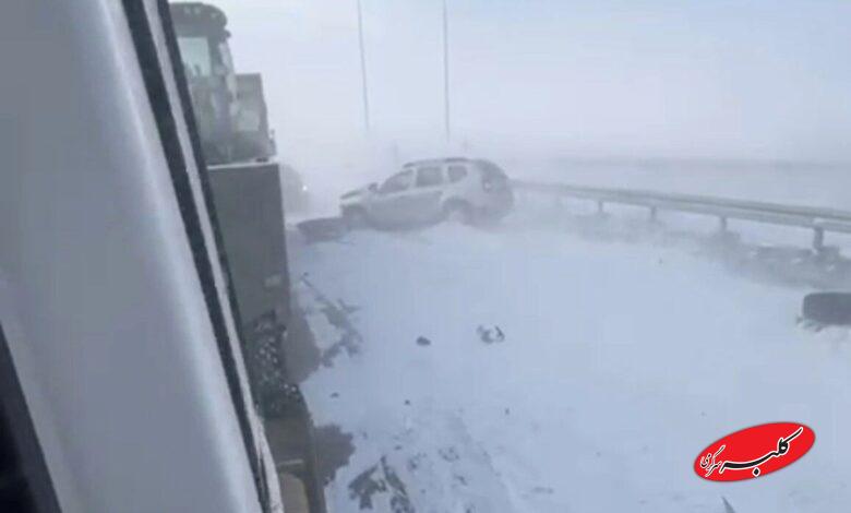 ببینید | کولاک شدید برف و تصادف همزمان حدود ۱۰ خودرو در جاده
