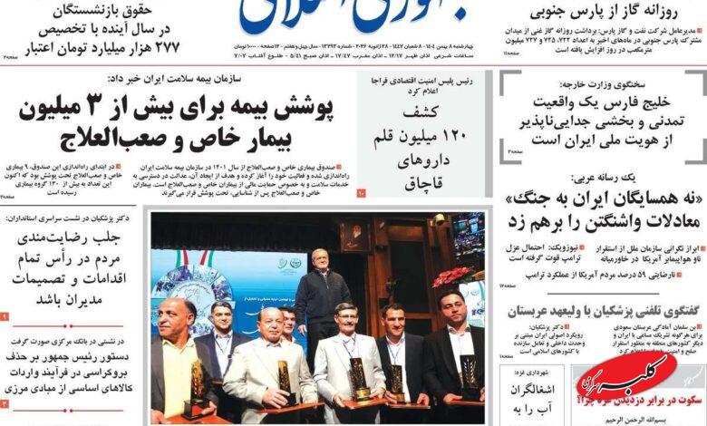 گفتگوی تلفنی پزشکیان با محمد بن سلمان، میزان افزایش حقوق کارمندان در سال ۱۴۰۵، بازشدن اینترنت برای بخشهای بیشتری از جامعه و… از تیترهای امروز مطبوعات است.