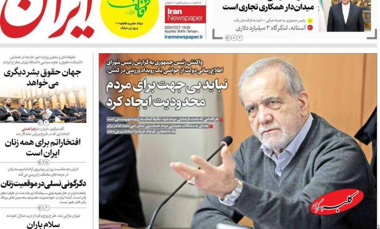 سخنان رئیس جمهور به مناسبت روز زن، سفز پزشکیان به قزاقستان و... از تیترهای مطبوعات امروز است.