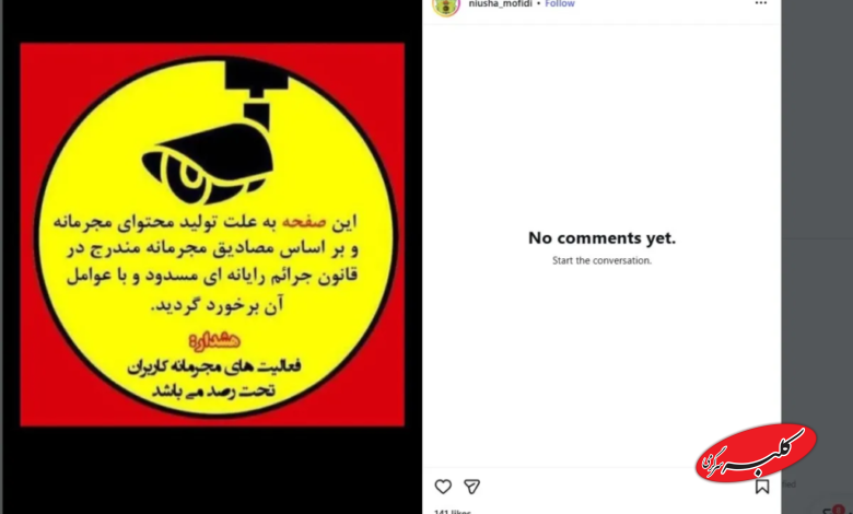 دیروز، کلیه پستهای صفحه اینستاگرام نیوشا مفیدی حذف شد و به جای آن، یک پست و یک استوری گذاشته شد که خبر از مسدود شدن این صفحه از سوی «پلیس امنیت عمومی» میدهد. همچنین، عکس پروفایل این صفحه نیز تغییر کرده است.