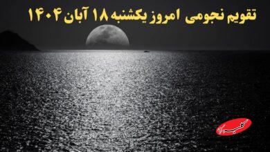 در تقویم نجومی امروز یکشنبه ۱۸ آبان ۱۴۰۴ که مصادف با برج عقرب است، موقعیت قمر در برج سرطان قرار…